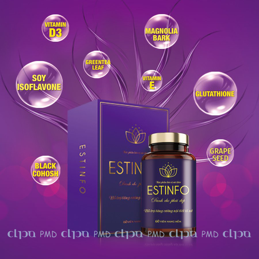 THỰC PHẨM BẢO VỆ SỨC KHỎE ESTINFO với sự kết hợp hoàn hảo giữa các thành phần hoàn toàn từ thiên nhiên như: - Tinh chất mầm đậu nành (Soy Isoflavone); - Chiết xuất Magnolia Bark (Chiết xuất từ vỏ hậu phác); - Chiết xuất Black Cohosh (Chiết xuất từ thiên ma), cùng nhiều chất chống oxy hóa mạnh (Glutathione, chiết xuất lá trà xanh, chiết xuất hạt Nho,...) giúp hỗ trợ tăng cường nội tiết tố nữ, níu giữ nét xuân, đồng thời giảm các triệu chứng do thiếu hụt nội tiết nữ gây ra. Estinfo là liệu pháp an toàn, tự nhiên giúp hỗ trợ tăng cường và bảo vệ sức khỏe, vẻ đẹp và sinh lý phụ nữ.