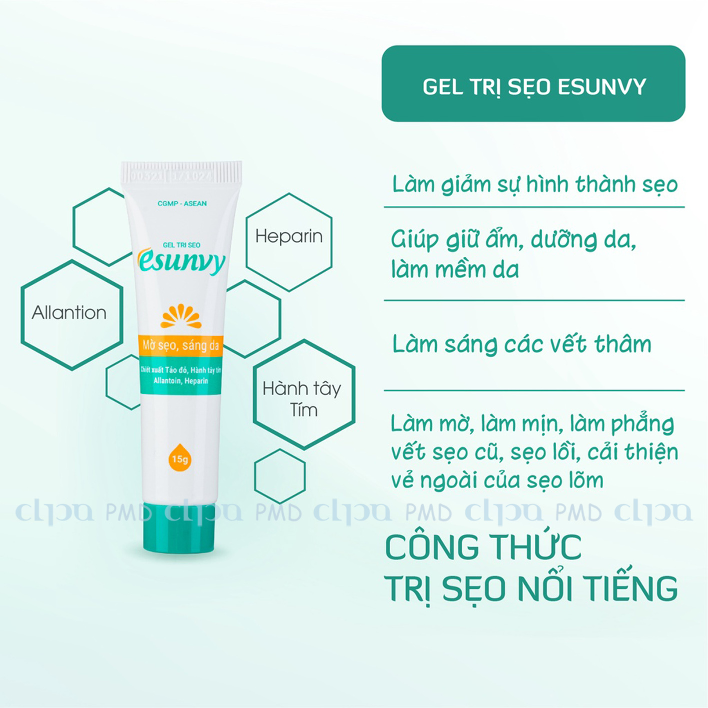 • Heparin Sodium: Cùng chiết xuất hành tây tím và Allantoin, Heparin giúp ức chế nguyên bào sợi tăng sinh, ngăn sẹo hình thành. Giảm viêm. Đẩy nhanh quá trình phân giải máu tụ và huyết khối, chống tăng sinh phì đại.