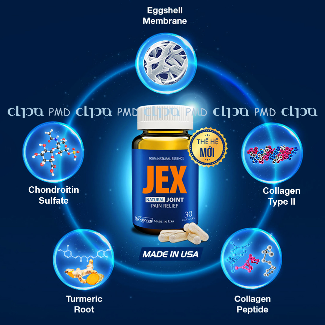 JEX thế hệ mới nay bổ sung thêm tinh chất Eggshell Membrane, kết hợp cùng bộ dưỡng chất: Collagen Type 2 & Collagen Peptide, Turmeric Root (Curcumin), Chondroitin Sulfate… được chiết xuất bằng công nghệ cao cấp, hiện đại bậc nhất thế giới, giúp “đánh trúng đích” vào cơ chế bệnh sinh của bệnh xương khớp